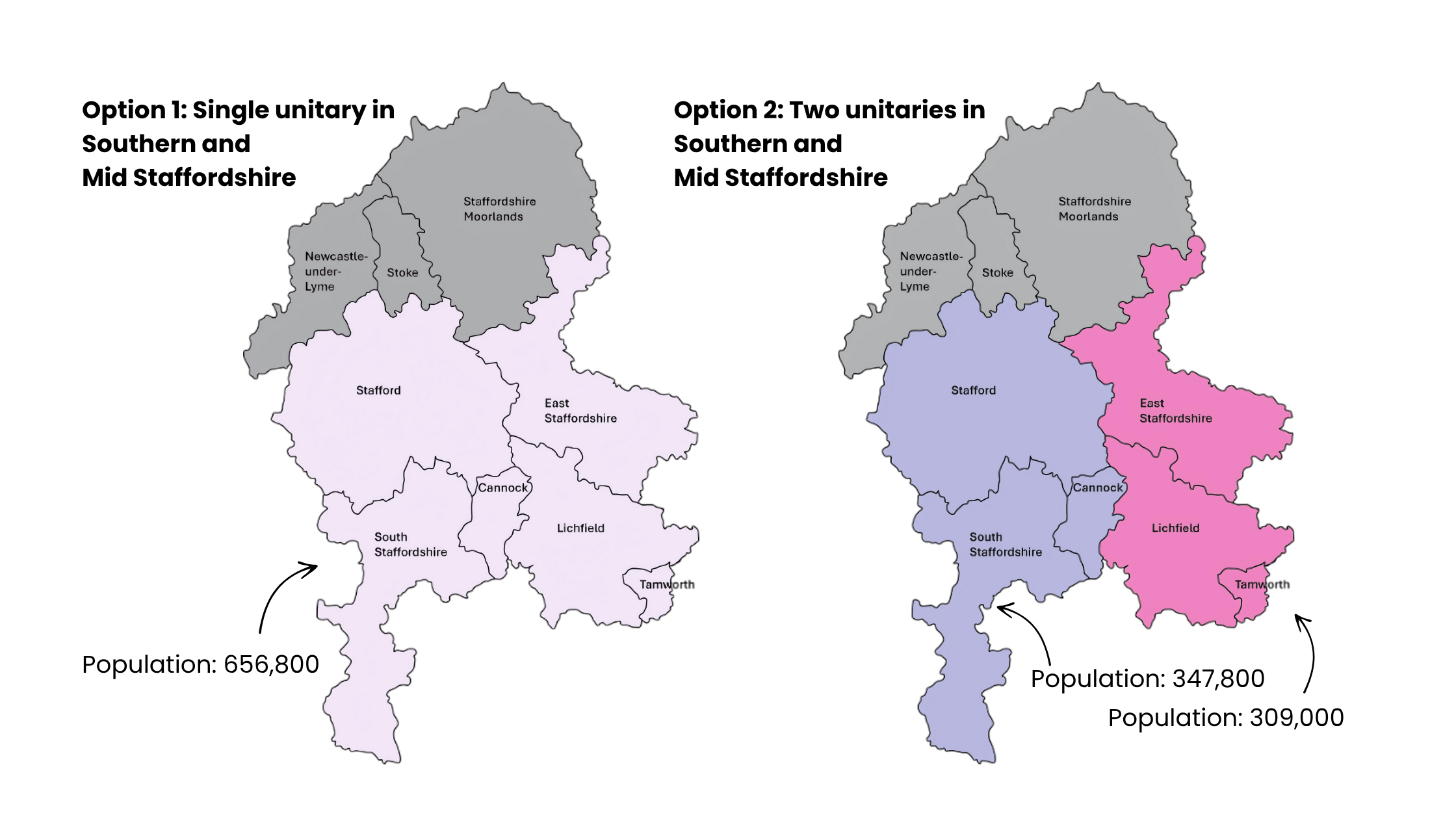 Staffordshire could be split into a total of 2 or 3 unitary councils, with one being in the North, and then Southern and Mid Staffordshire have 1 or 2 unitary councils. Over recent months, Lichfield District Council has been working closely with five neighbouring councils (Cannock Chase, East Staffordshire, South Staffordshire, Stafford and Tamworth) to explore what this could mean for our communities and to look at the feasibility of merging into a single unitary, or two unitary councils.